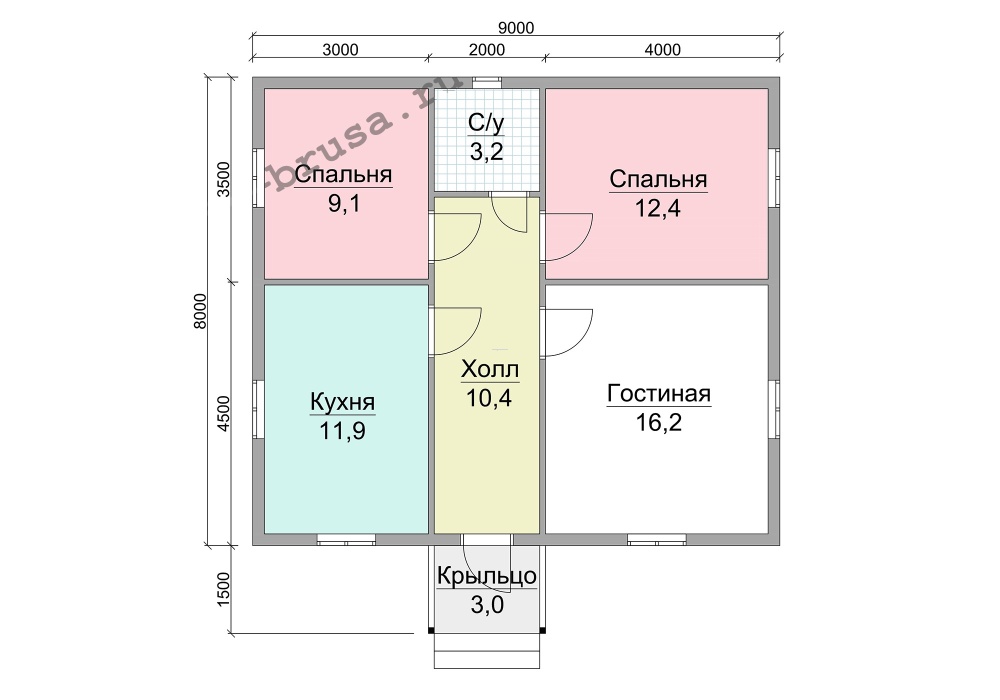 Общая площадь помещений – 63.2 кв.м., размер дома – 8х9 м.. Зимние двойные окна обеспечивают естественное освещение и проветривание комнат.